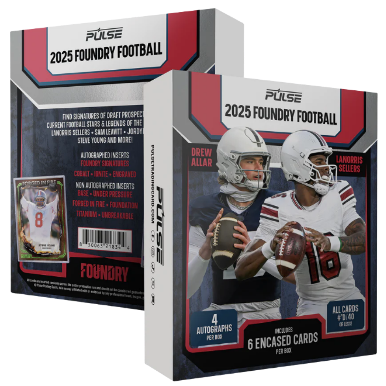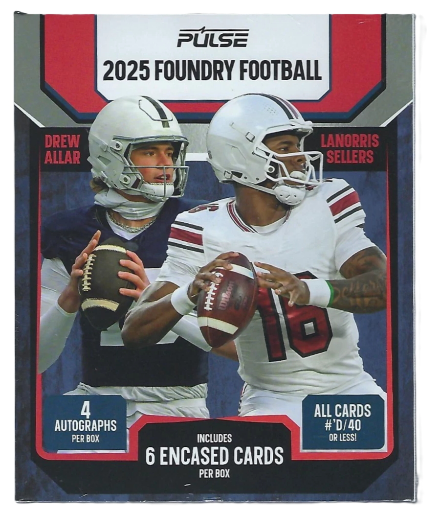 The 2025 Pulse Foundry Football series forges the future of the game—featuring elite prospects, iconic legends, and today’s top stars. Each box includes 6 premium cards, with 4 autographs per box, and every card numbered to 40 or less, sealed in a jewel case for ultimate display.