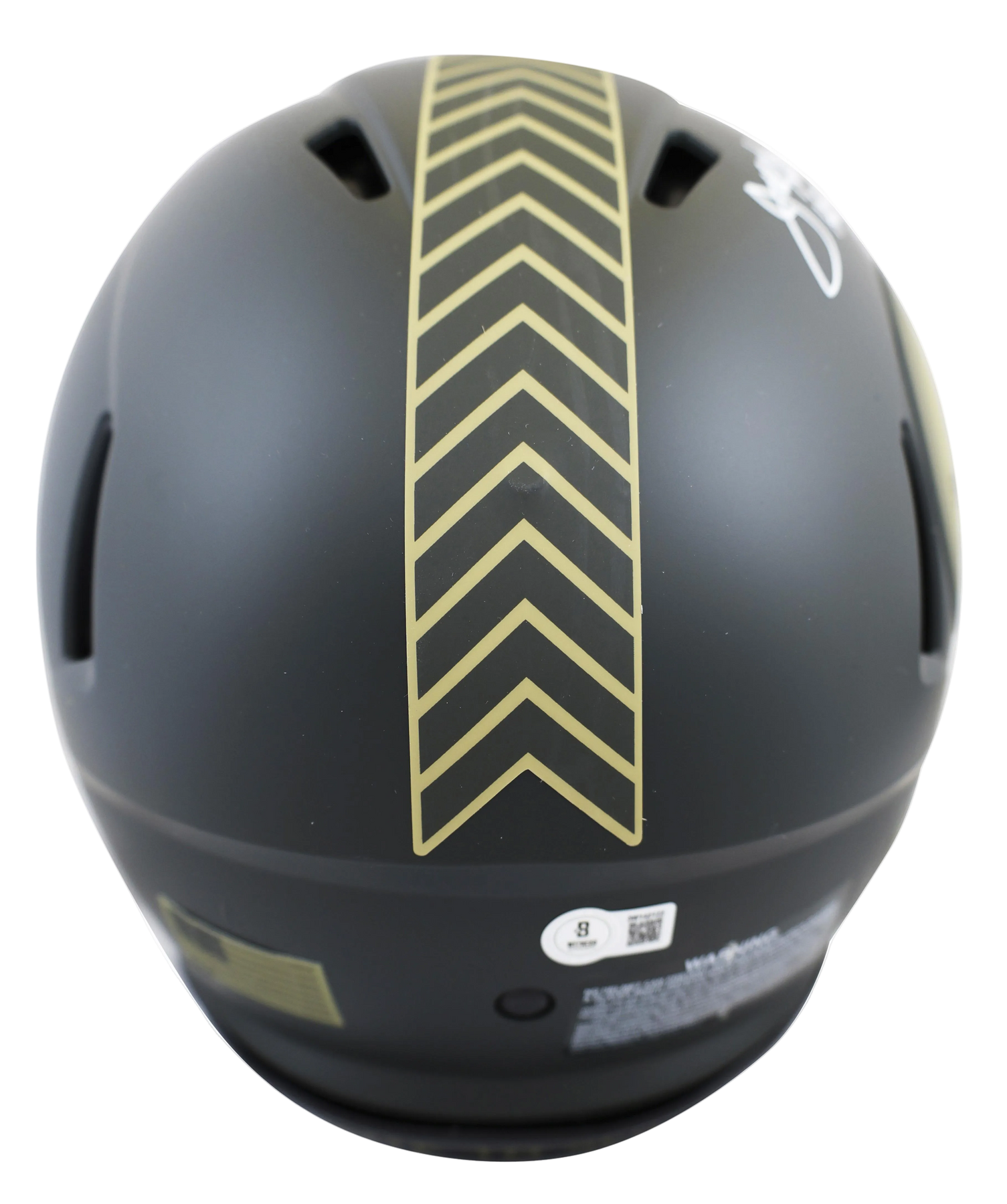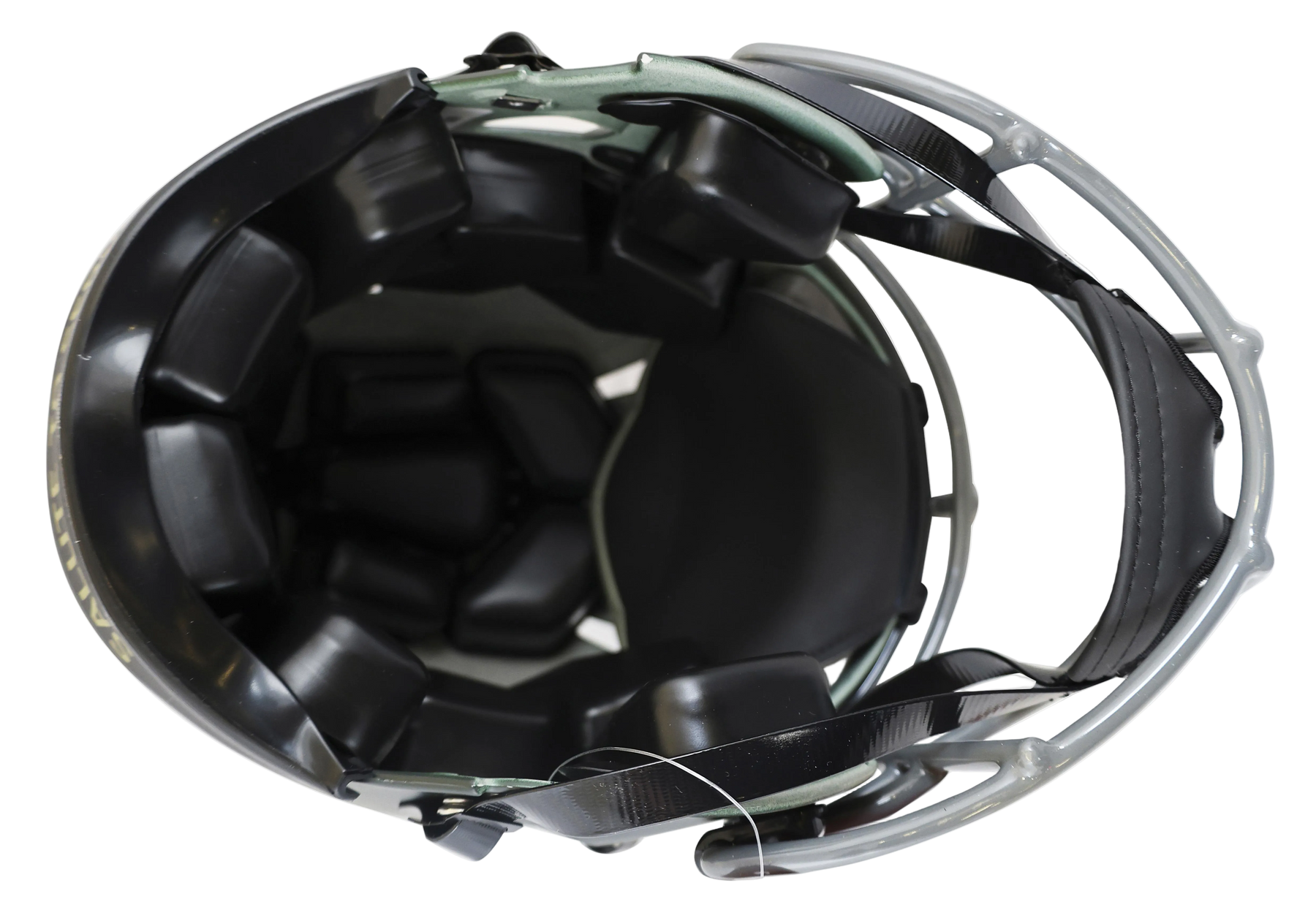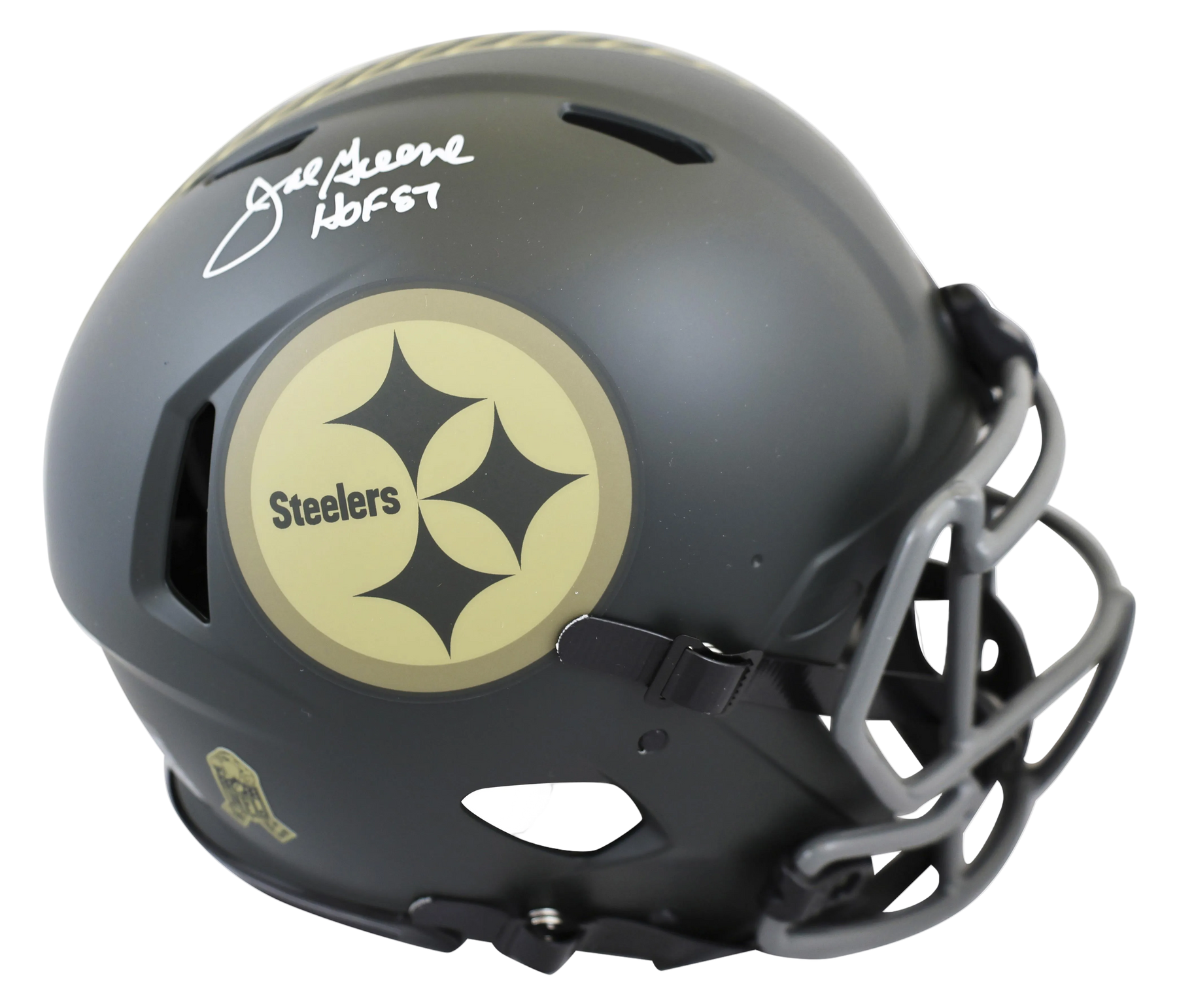 Riddell Pittsburgh Steelers full-size authentic on-field salute to service alternate speed helmet has been hand-signed and inscribed by Joe Greene (HOF). Display case is included as shown.
