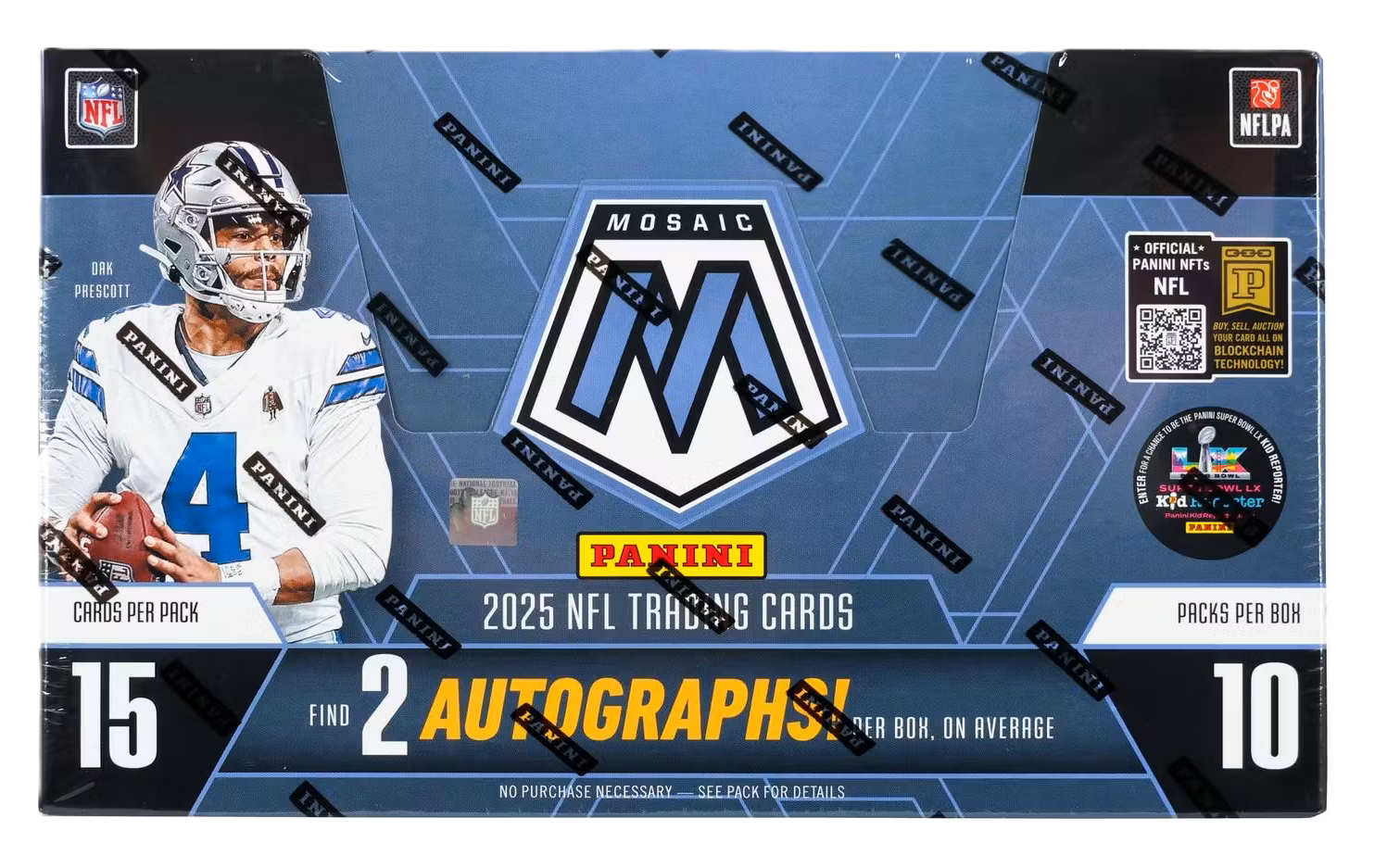 Each Box contains 2 Autographs, 5 Silver Prizms, 15 Mosaic Prizms, and 20 Inserts on average!