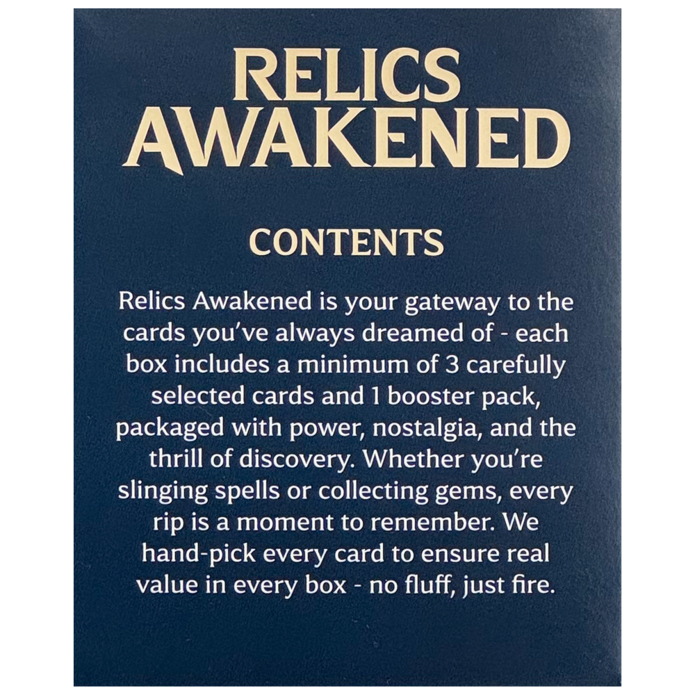 Relics Awakened comes with a minimum of 1 booster pack and 3 cards. Each card is hand-picked to ensure real value in every box. All boxes are correlated to give the consumer a great experience and to have something to instantly add into their decks to be playable.